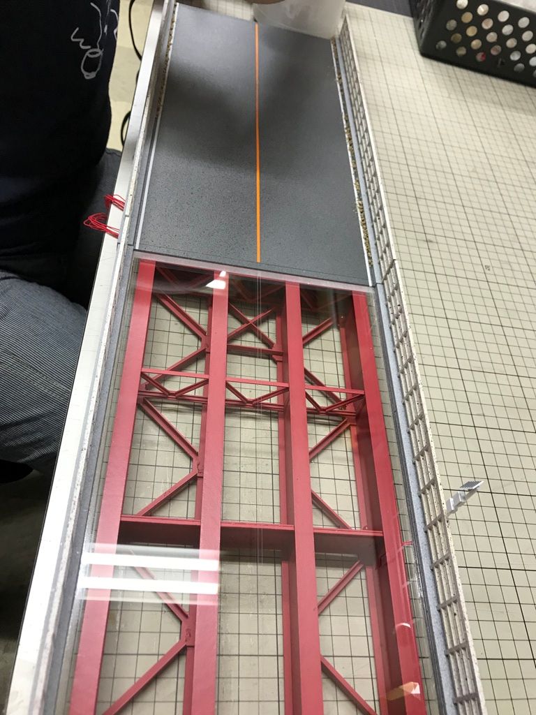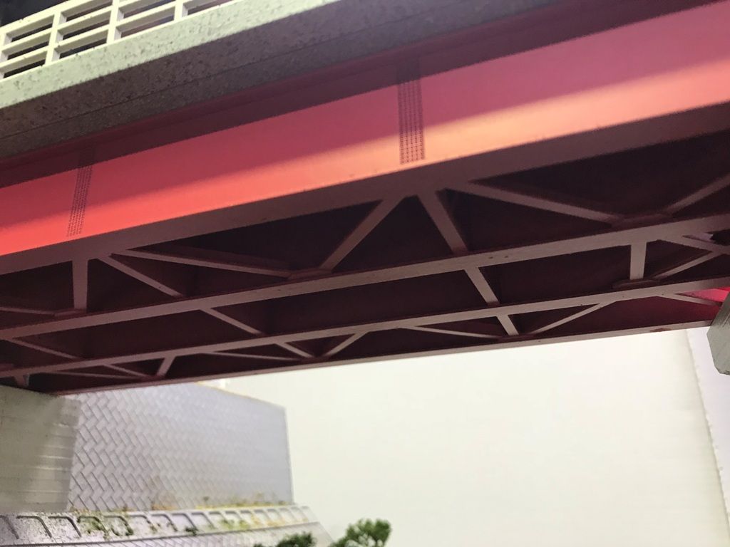 振動センサーの展示と言うことで、橋の下側(橋桁)にセンサーを設置している様子を模型で表現するために、橋の半分は透明な道路にして、さらにセンサーの設置場所が分かるように点滅するLEDを設置しました。