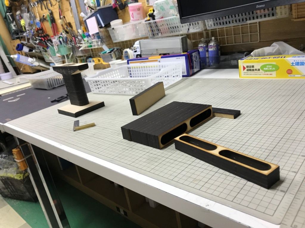 先ずはCADで模型の設計図を作り、レーザーカットした材料を組み立てていきます。